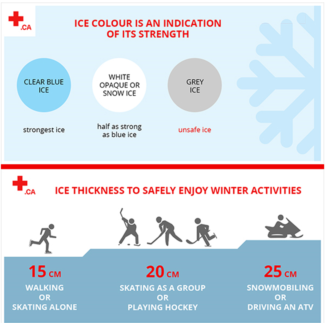 The Town follows Canadian Red Cross guidelines for ice thickness. Ice must be thick enough to safely support people and equipment before public use is allowed.