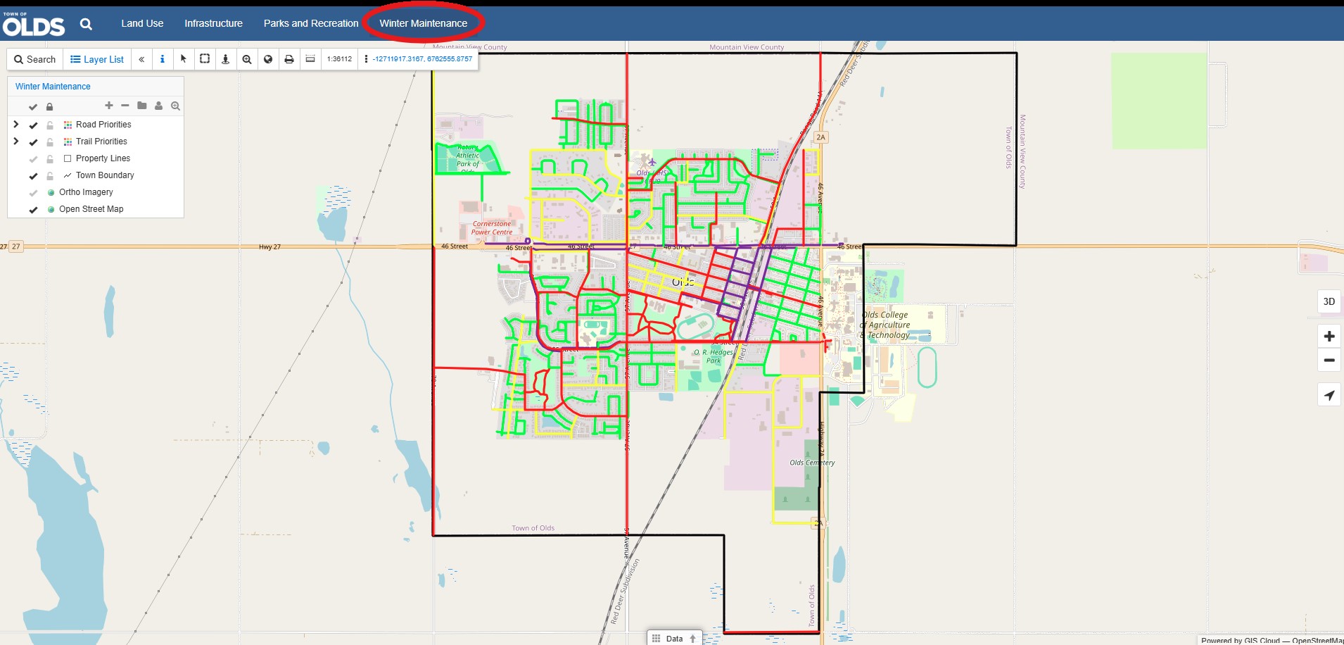 - Priority 1 (Purple) – High traffic, Highway 27 (46 Street), main collectors, and school routes