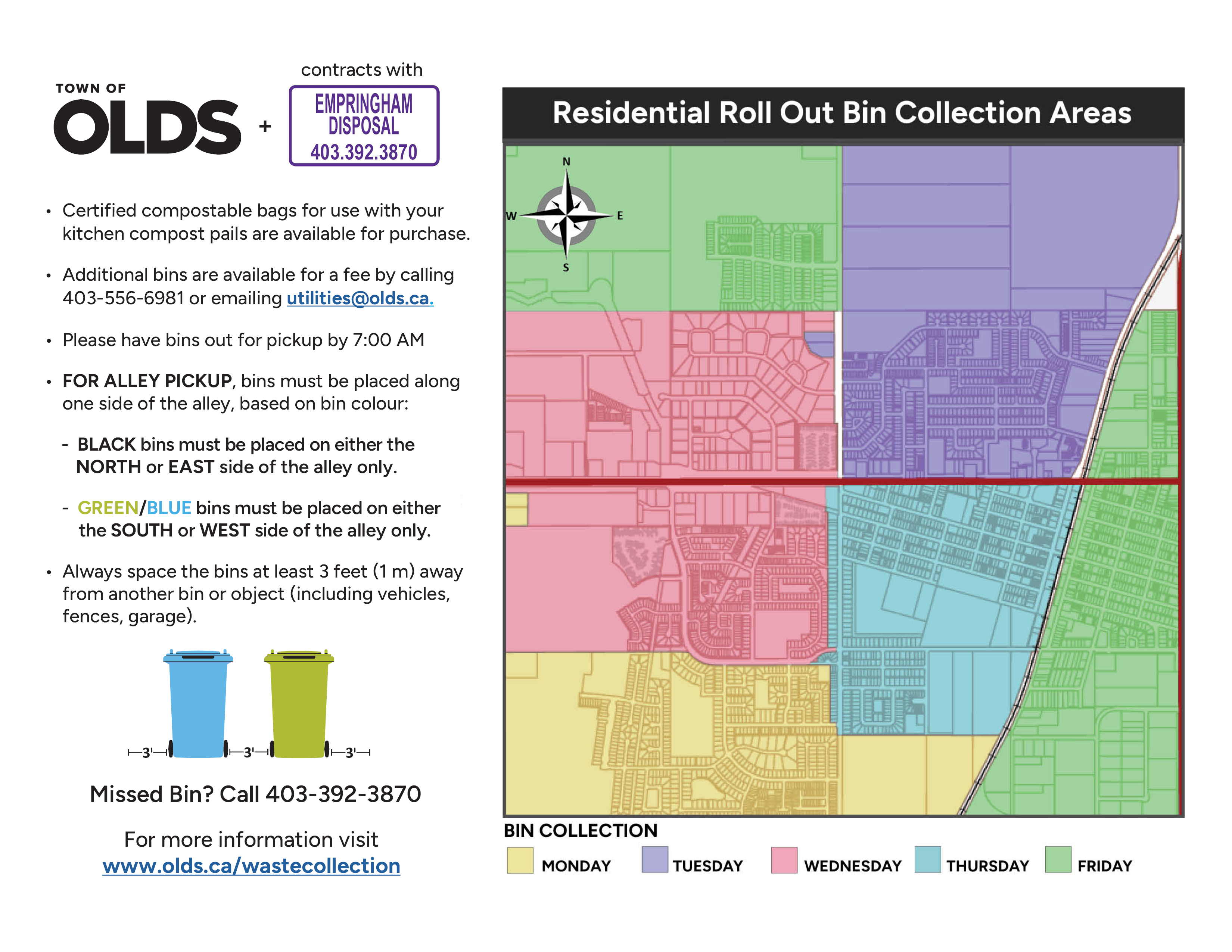 If your bin met all requirements but was not collected, please call Empringham Disposal at 403-392-3870 with your name, address, phone number, and colour of bin missed.